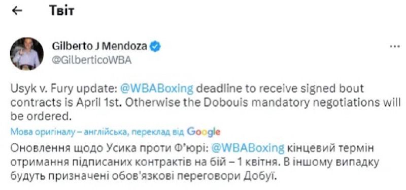 "Оновлення щодо бою Усик – Ф'юрі. Крайній термін WBA для отримання підписаних контрактів на цей бій – 1 квітня. В іншому випадку будуть призначені обов'язкові переговори Усика з Дюбуа", – заявив Мендоса.