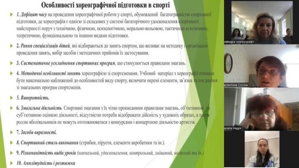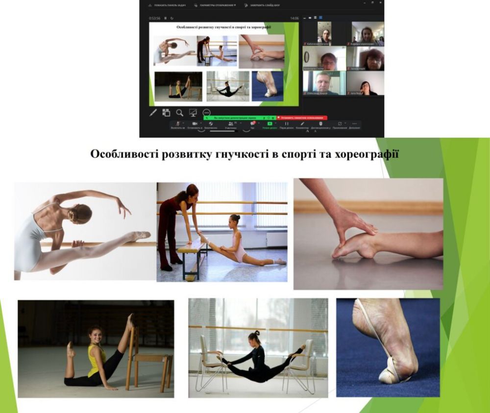 Лекторка ознайомила аудиторію зі специфікою хореографічної підготовки дітей та учнівської молоді у спорті, особливостями розвитку гнучкості на заняттях хореографії, схарактеризувала різні види уроків для спортсменів, а також зосередила увагу на проблематиці запобігання травматизму у професійній хореографічній діяльності. Спікерка акцентувала на важливих аспектах синтезу хореографії і спорту як окремого напрямку розвитку хореографічної освіти в умовах сьогодення.