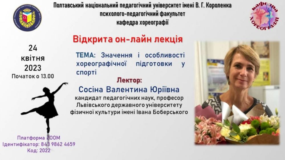 24 квітня 2023 р. кандидатка педагогічних наук, професорка Львівського державного університету фізичної культури імені Івана БоберськогоВалентина Сосіна провела відкриту онлайн-лекцію на тему «Значення і особливості хореографічної підготовки у спорті» для здобувачів і викладацького складу кафедри хореографії Полтавського національного педагогічного університету імені В. Г. Короленка. Вона представила слухачам результати своїх багаторічних теоретичних і практичних напрацювань у галузі хореографії в спорті.