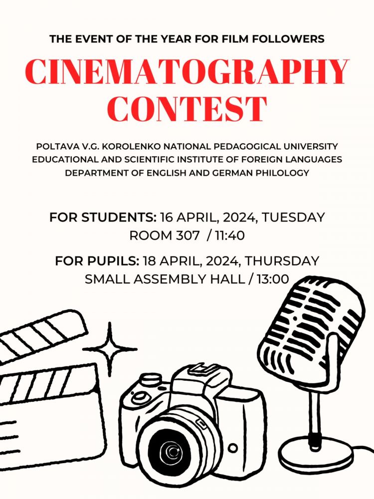 Кафедра англійської та німецької філології Полтавського національного педагогічного університету імені В. Г. Короленка оголошує Конкурс «Англійський кінематограф» для учнівської молоді Полтавщини, який відбудеться дистанційно в Полтавському національному педагогічному університеті імені В. Г. Короленка 18 квітня 2024 р.