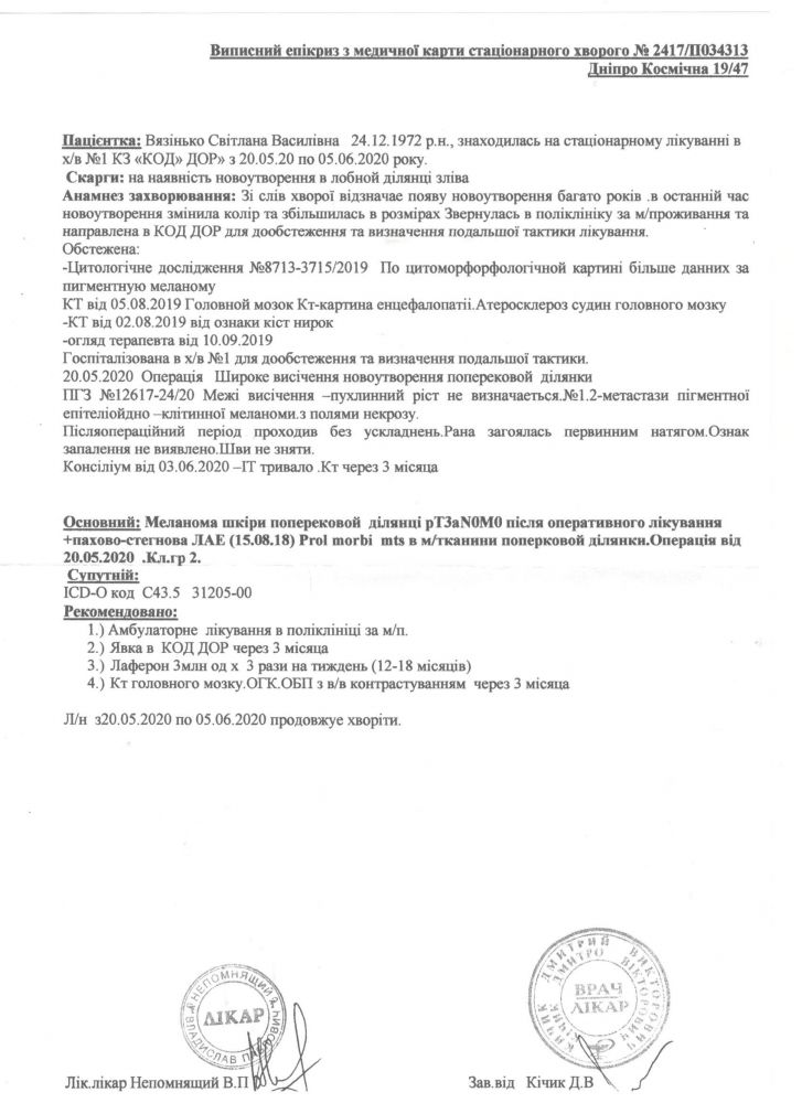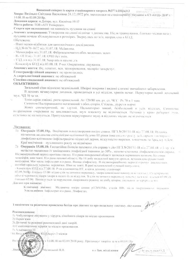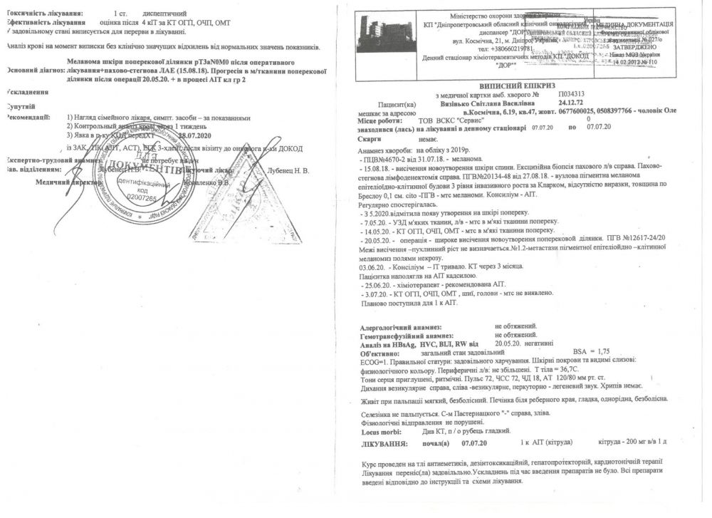 У Світлани онкологічне захворювання. Меланома шкіри поперекової ділянці 3 ступеню. З 2018-го року Світлана перенесла дві операції по видаленню пухлини та метастаз. Зараз потребує лікування препаратом Кітруда. Одна крапельниця цього препарату коштує 128 000 (сто двадцять вісім тисяч, 00 коп.) гривень. Весь курс складається з 12 таких процедур, а це більш ніж півтора мільйона гривень.